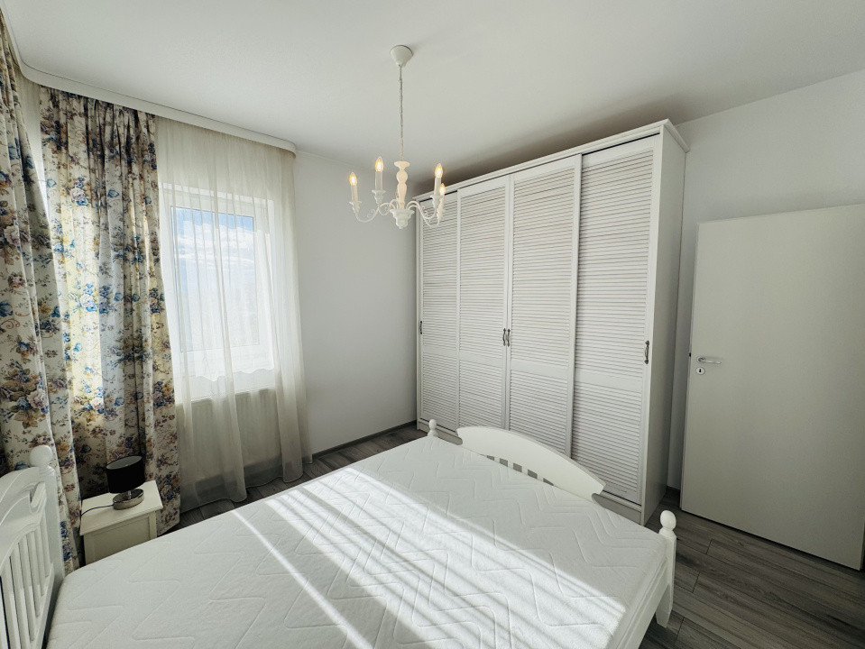 Suprafață vitrată mare, mașină de spălat rufe, geam la baie, colțar extensibil, ușă metalică la intrare, pat 160×200, dulap în dormitor cu uși culisante